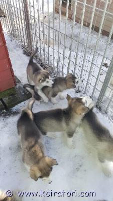 Alaskanmalamuutin muutama narttupentu ja yksi urospentu etsivät omia kotejaan.
