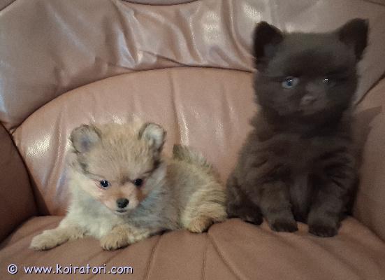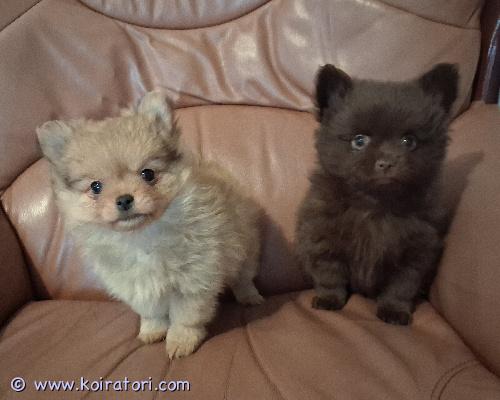 Kaksi pientä luovutusikäistä pentua, poika ja tyttö, pomeranian ja chihuahuan sekoitus. Ruskea on poika ja vaaleampi pentu on tyttö.